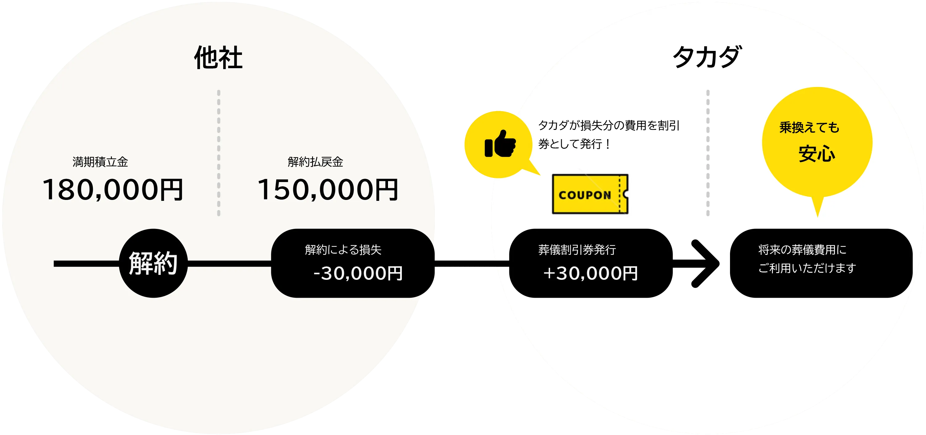 他社の会員を退会・解約する際に発生する解約手数料の相当額を葬儀利用券として発行し、お客様の解約損失金を実質0円にいたします。